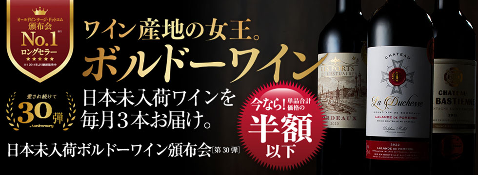 当店ソムリエが厳選するボルドーワインが毎月3本味わえる、人気No.1コース。